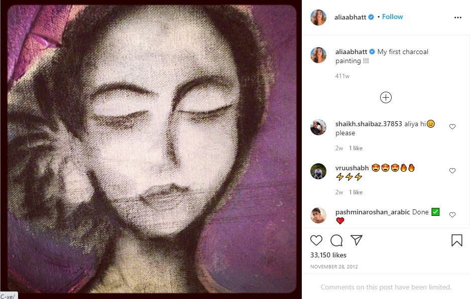 Alia Bhatt’s first post, on November 28, 2012, was a photo of her first charcoal painting. This personal post received over 41K likes.