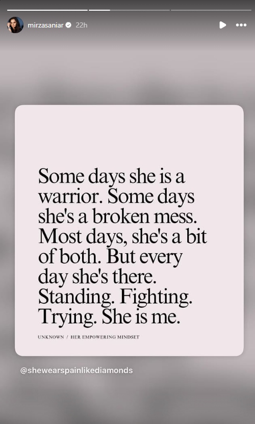 In her latest Instagram story, Sania shared a poignant message that read: “Some days she is a warrior. Some days she’s a broken mess. Most days, she’s a bit of both. But every day, she’s there. Standing, fighting, trying. She is me.”