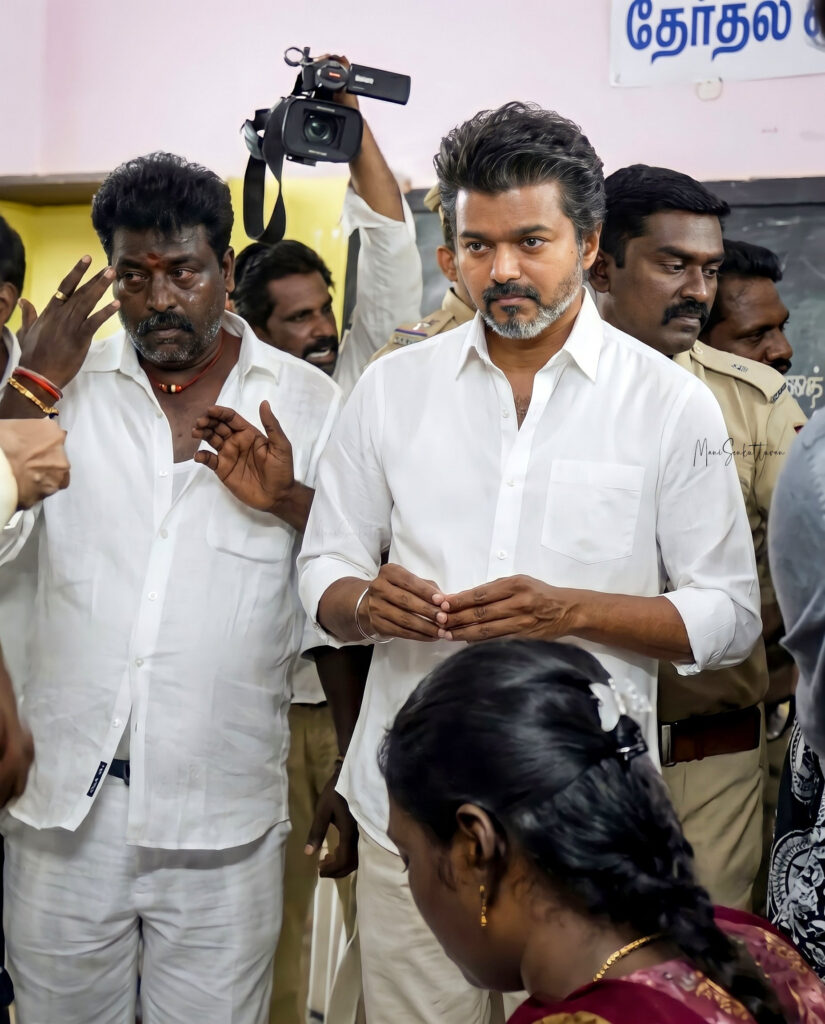 Tamil superstar and TVK chief Thalapathy Vijay, contesting from Tiruchirappalli East and Perambur, visited a Chennai polling booth. Fans gathered in large numbers to see him as he cast his vote and left the station.