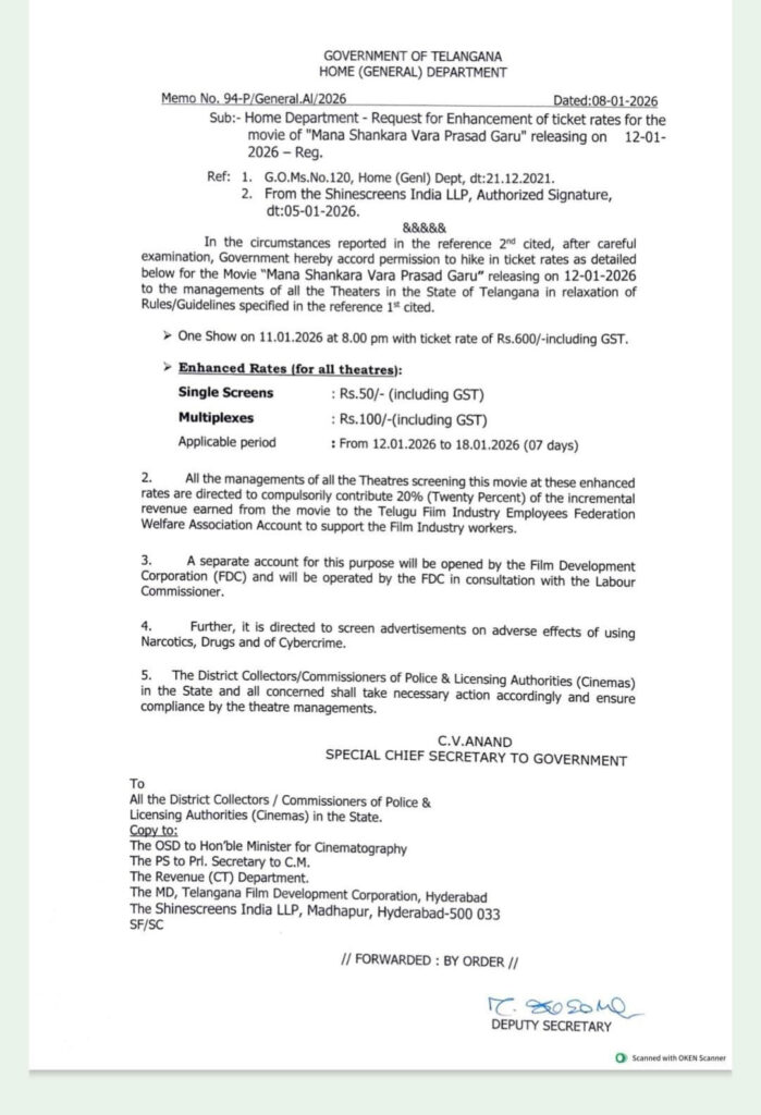 Hyderabad: The Telangana government has allowed a ticket price hike for Chiranjeevi’s new movie, Mana Shankara Varaprasad Garu. The movie will have paid premiere shows tomorrow, with ticket prices set at Rs. 600 in the Nizam area. The new prices are Rs. 227 for single screens and Rs. 395 for multiplexes. The price hike will last for seven days, and the theatres will give 20% of the extra earnings to the Employees Federation Welfare Association.