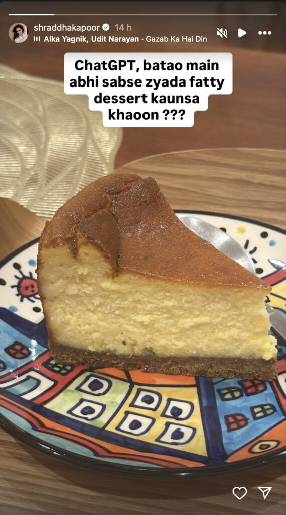 Dropping an appetizing photo of a piece of cake on the Stories section of her Instagram, the ‘Stree’ actress wrote, “ChatGPT, batao main abhi sabse zyada fatty desert kaunsa Khaoon??? (ChatGPT, tell me which is the fattiest dessert I should eat right now???) (sic)”