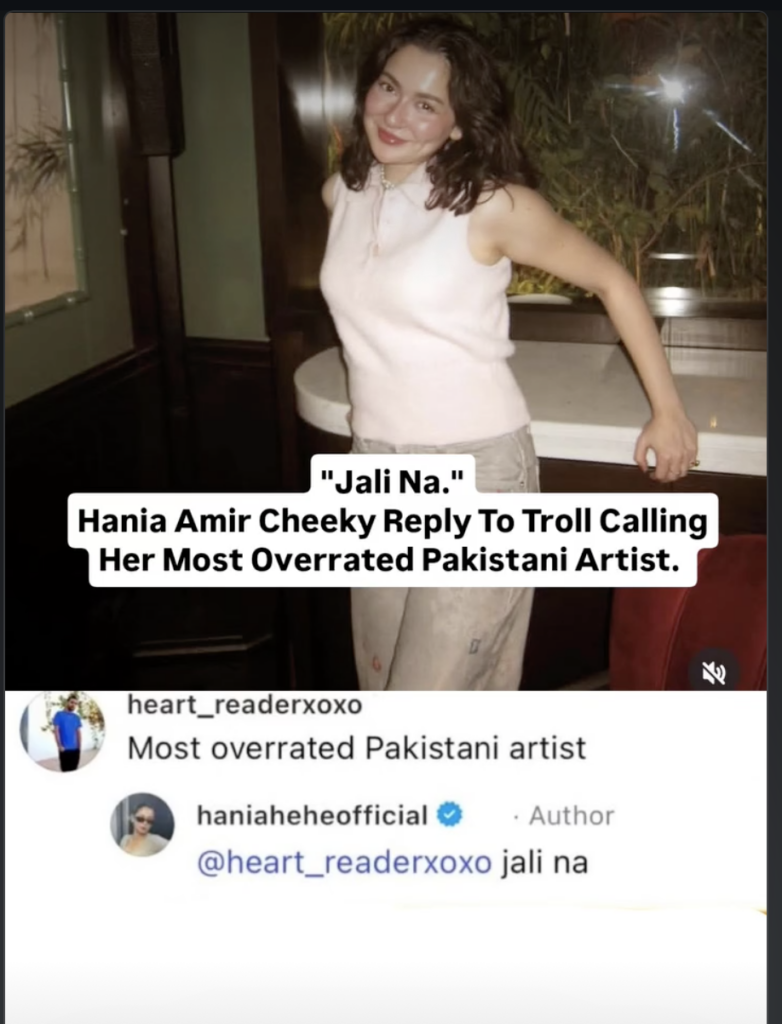 A screenshot that is now going viral shows a user calling her the “most overrated Pakistani artist.” Instead of ignoring the remark or reacting strongly, the actress chose humour over hostility.