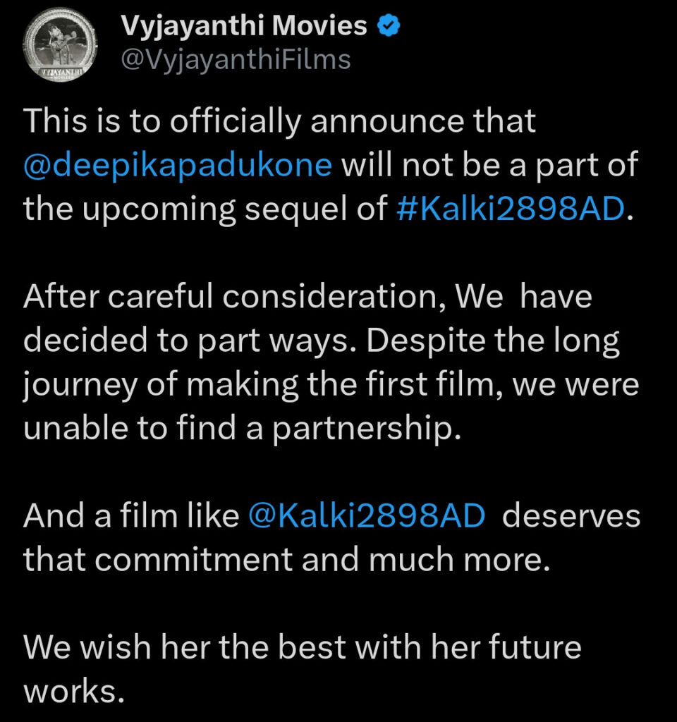 As of now, the production house behind Kalki 2898 AD, Vyjayanthi Movies, has not issued any official statement regarding the online chatter. For the unversed, back in September, the makers had officially announced Deepika’s exit from the Kalki sequel through their X handle, citing creative differences.