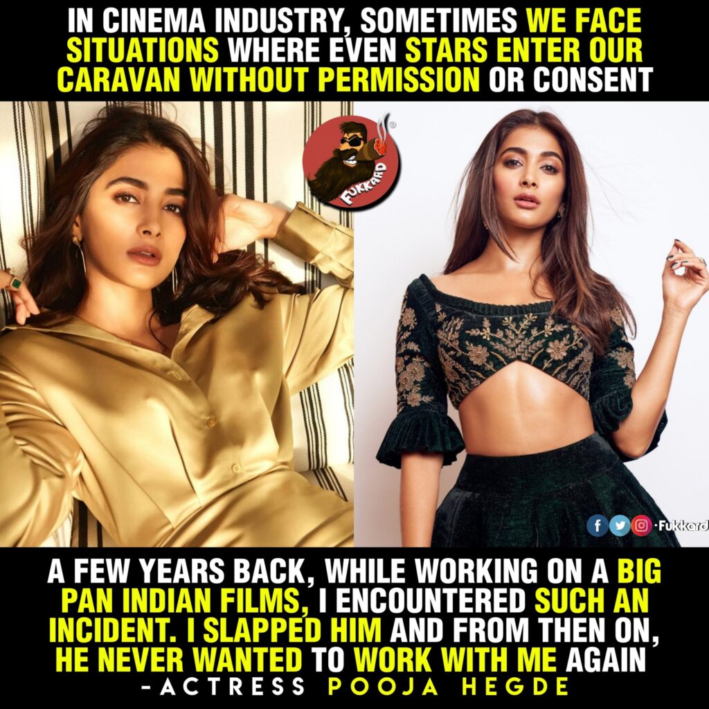 A viral image quote attributed to Pooja Hegde has sparked widespread debate online. The actress is allegedly quoted as saying, “In cinema industry, sometimes we face situations where even stars enter our caravan without permission or consent. A few years back, while working on a big pan indian films, i encountered such an incident. I slapped him and from then on, he never wanted to work with me again.”