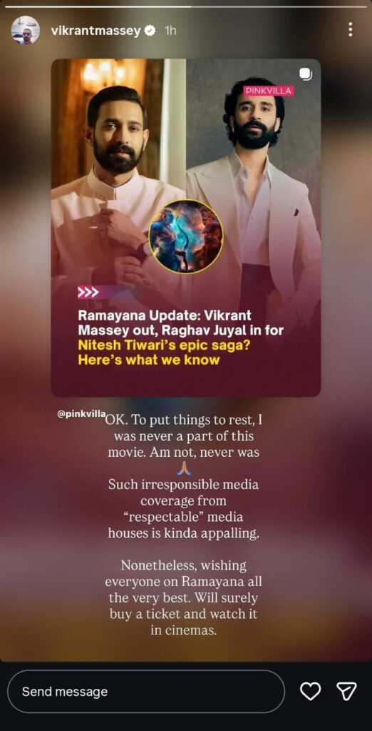 To put the speculation to rest, Vikrant took to his Instagram Story and said, “OK. To put things to rest, I was never a part of this movie. Am not, never was. Such irresponsible media coverage from ârespectable’ media houses is kinda appalling. Nonetheless, wishing everyone on Ramayana all the very best. Will surely buy a ticket and watch it in cinemas.”