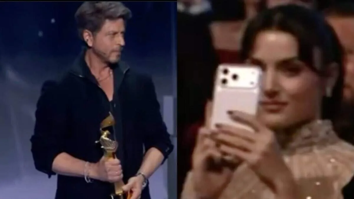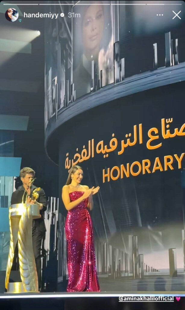 As Shah Rukh Khan stood on stage alongside Egyptian film actress Amina Khalil, the camera caught Hande Erçel recording the moment on her phone from the audience. The short clip quickly spread across social media and SRK fan pages, with many users playfully calling Hande a “total fangirl.”