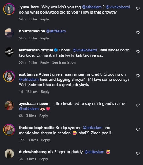 Despite the track being a duet between Atif Aslam and Shreya Ghoshal, and despite Vivek Oberoi lip-syncing only to Atif’s vocals, he skipped mentioning the Pakistani singer altogether. The caption credited Shreya Ghoshal as the only singer, prompting fans to call out the deliberate omission.