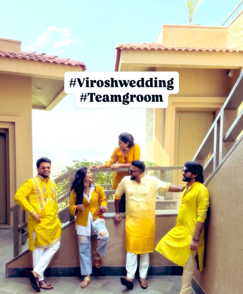 The haldi and mehendi ceremonies are scheduled for Wednesday, with guests expected to dress in yellow. Stylist Shyavya Varma shared a group photo featuring director-actor Tharun Bhascker, actor Eesha Rebba, and other guests, all in yellow attire.